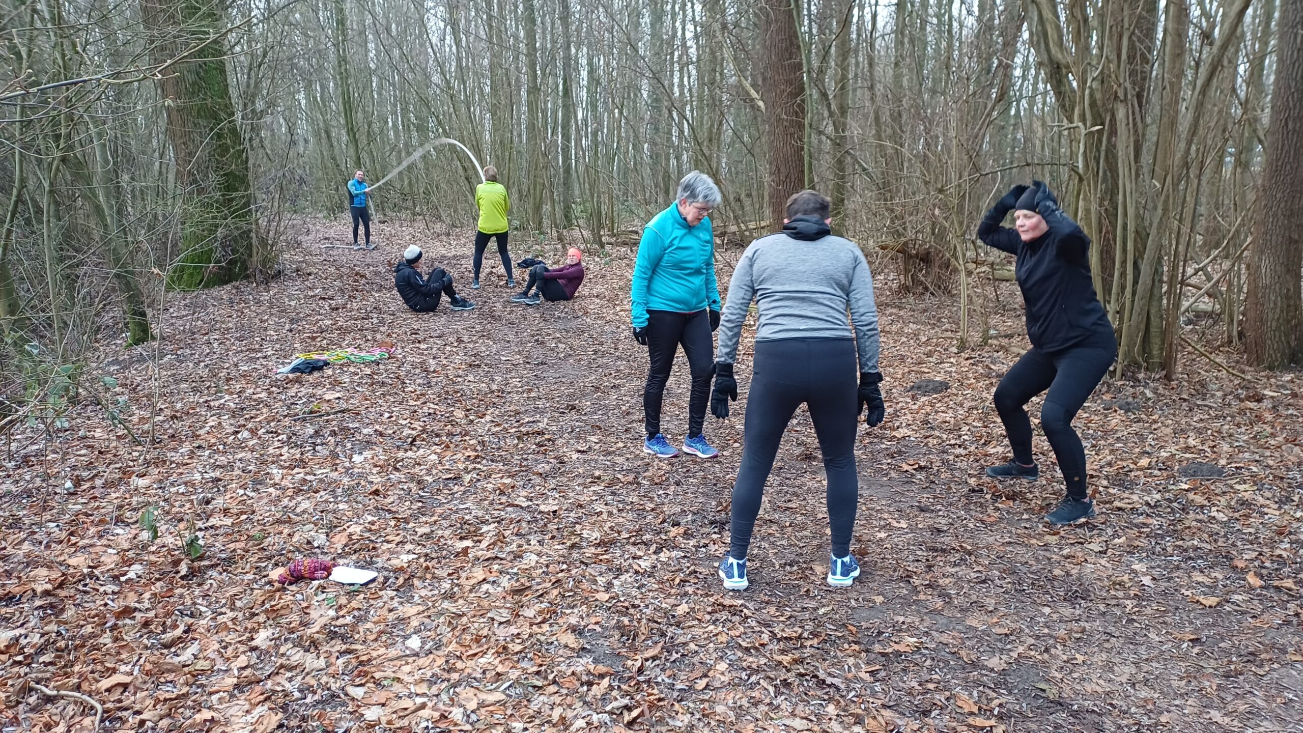 Zaterdagmorgen zou het weer een koude, schrale training worden. Maar daar weten wij wel raad mee. De deelnemers werden aan een scheepstouw gezet (om wegwaaien / verdwalen) te voorkomen en zo werd er richting bosrand gelopen. Eenmaal in het bos was er geen zuchtje wind meer te bekennen en werd er lekker getraind. Tja, als het nodig is, geven wij gewoon een draai aan de training.